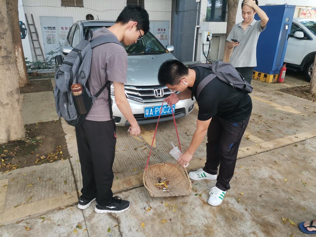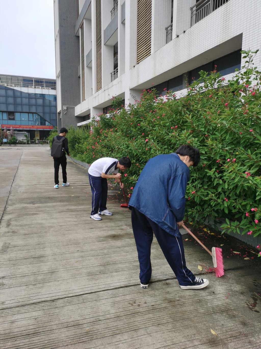 每天中午,各班同学在班长的组织下,手持清扫工具,对中巴楼到明智篮球场划分的6个区域进行打扫,清扫地面的垃圾,用钳子夹起地上以及草丛旁的烟头纸屑,以及清理墙上的旧宣传单。活动中,同学们分工明确,各尽其力,不一会便把校园一角清理干净了。