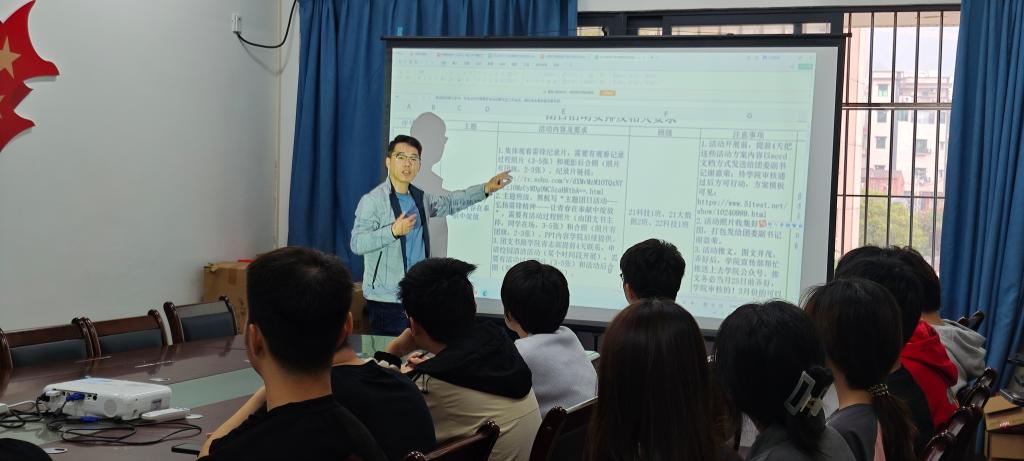 此次会议中,团委书记梁燕龙辅导员从基本原则、活动内容及时间和学院团日活动安排三部分展开说明。在基本原则中,强调了此次活动的四项基本原则:突出政治引领、激励挺膺担当、尊重青年特点以及加强示范带动,并说明此次活动团员要做到积极带领,鼓励班级群众也加入到此次活动中。在学院团日活动安排中,梁燕龙辅导员展示了各班活动安排对应的主题、时间以及注意事项,主题具有当月特色,比如三月的《弘扬雷锋精神》主题和四月的《传承红色基因》主题。在会议最后,梁燕龙辅导员重点介绍了相关注意事项,包括活动开展前要求提前写好班级方案以及活动后写好推文、活动期间做好记录和拍照以及保障好同学的安全。