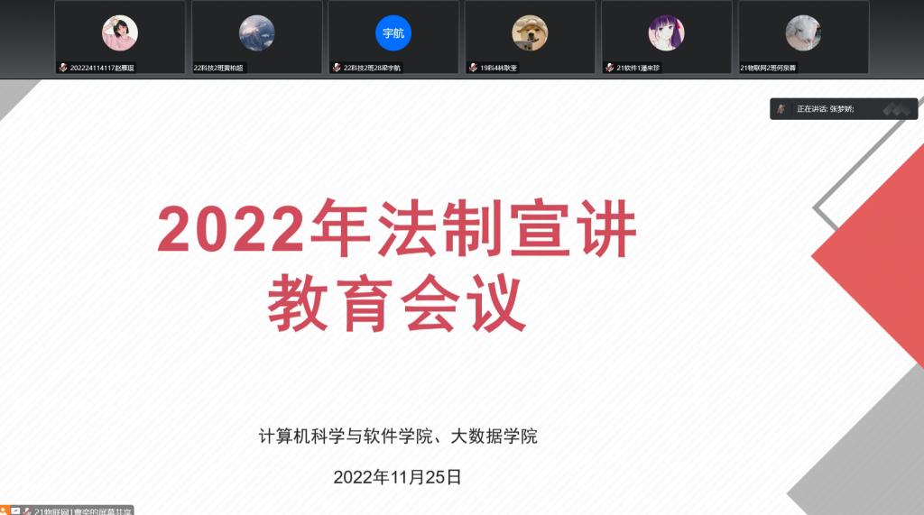 为增强TapTap点点学生的法制观念,树立良好的法律意识,提高自我保护能力,营造安全、文明、和谐的校园法治教育环境,2022年11月25日TapTap点点辅导员张梦娇老师在线上召开法制宣讲教育会议,参加本次会议的成员有辅导员、朋辈辅导员及各班学生代表。