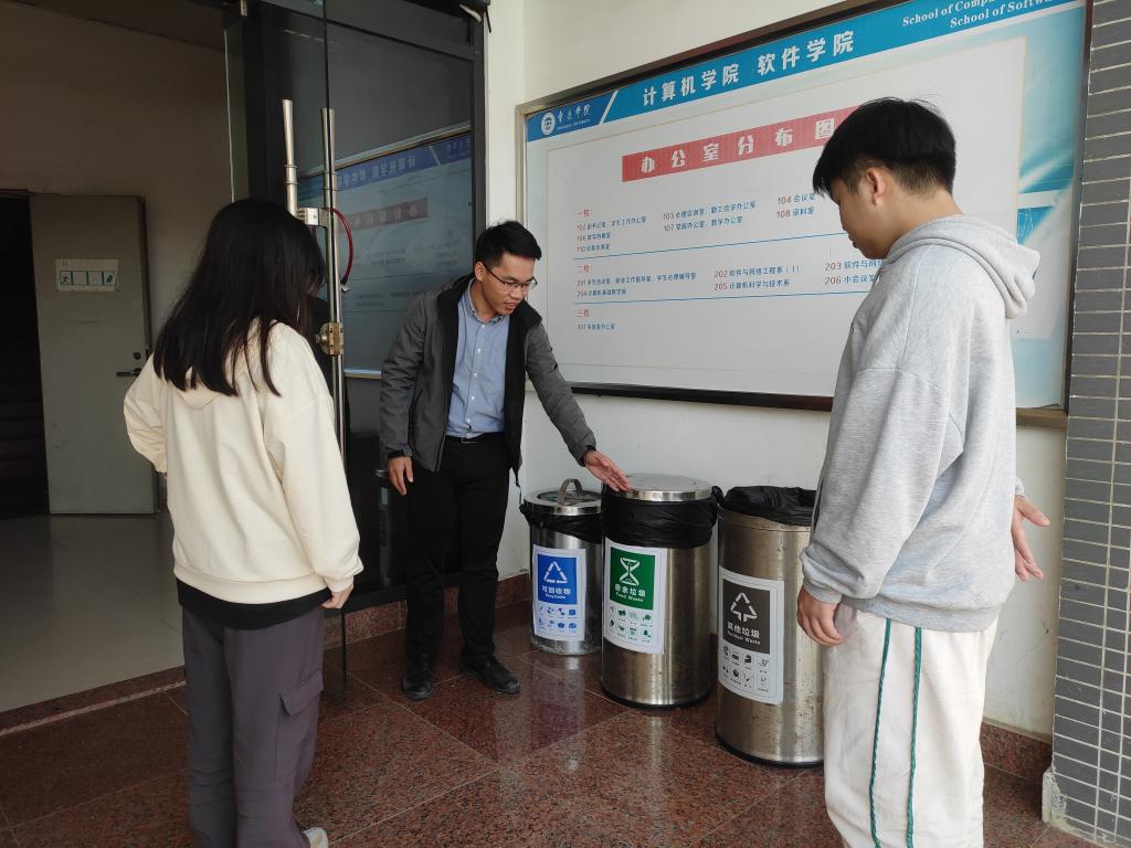 学院辅导员老师也亲自在分类垃圾桶旁边指导学生进行正确的分类投放。
