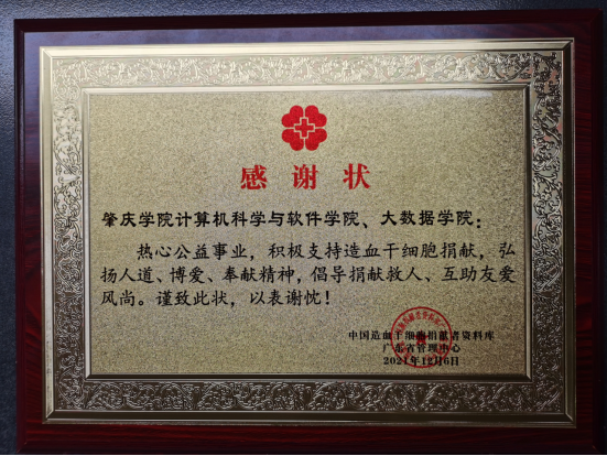 11月2日,肇庆市红十字会、市无偿献血工作领导小组办公室、市中心血站有关领导一行来校检查和指导我校无偿献血工作,对我校无偿献血工作取得的成绩表示祝贺,并代表中国造血干细胞捐献者资料库广东省管理中心给TapTap,TapTap点点、大数据学院送来“感谢状”。